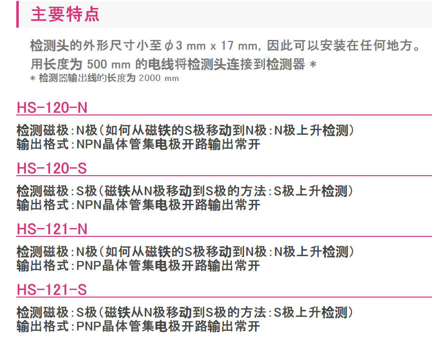它是一種磁傳感器,可以高精度檢測精密移動工作臺的原點中心位置。在磁體中心輸出開關(guān)信號進(jìn)行檢測,可獲得士0.05μm的高重復(fù)性。檢測頭緊湊,直徑中3 mm。另外,因為是磁檢測方式,所以不受污垢和厭塵的影響。我們還提供“HS-320”系列,它具有出色的耐環(huán)境性。