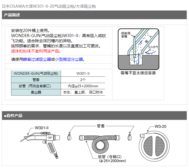 日本OSAWA大澤W301-II-20氣動吸塵槍