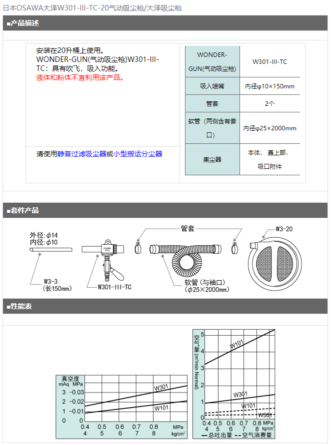 日本OSAWA大澤W301-III-TC-20氣動吸塵槍