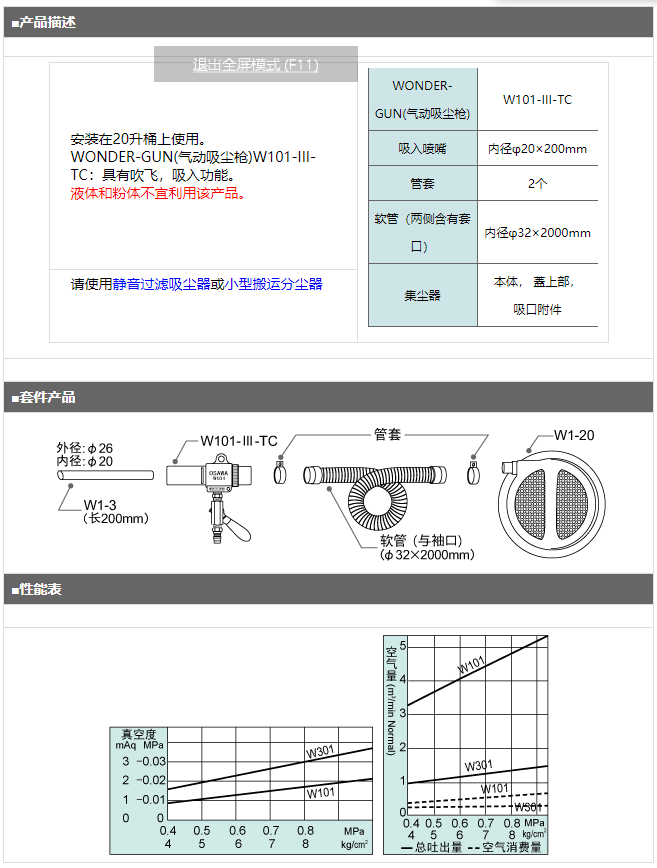 日本OSAWA大澤W101-III-TC-20氣動(dòng)吸塵槍