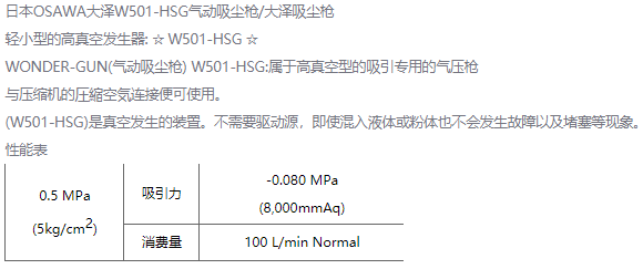 產(chǎn)品簡介: 日本OSAWA大澤W501-HSG氣動吸塵槍/大澤吸塵槍 輕小型的高真空發(fā)生器: ☆ W501-HSG ☆ WONDER-GUN(氣動吸塵槍) W501-HSG:屬于高真空型的吸引專用的氣壓槍