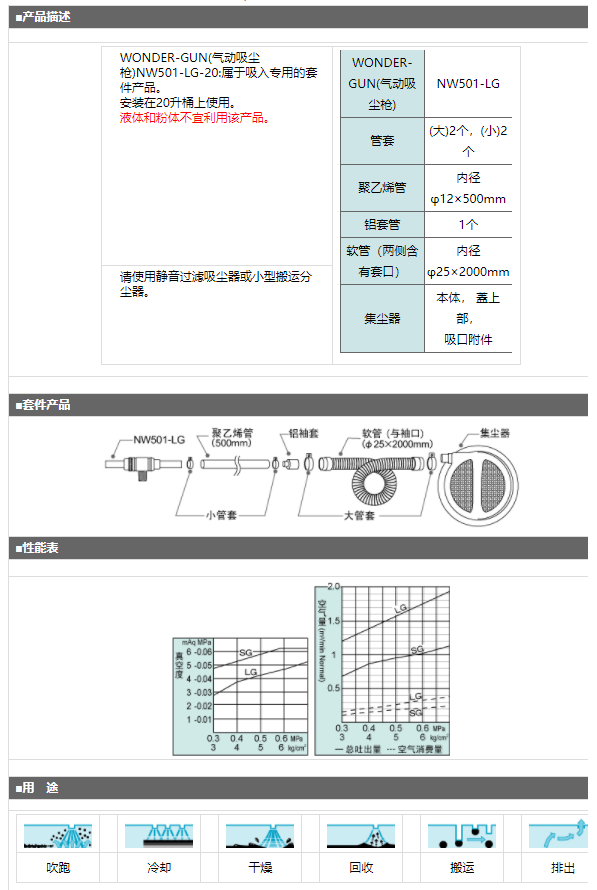 產(chǎn)品簡介: WONDER-GUN(氣動(dòng)吸塵槍)NW501-LG-20:屬于吸入專用的套件產(chǎn)品。 安裝在20升桶上使用。 液體和粉體不宜利用該產(chǎn)品。