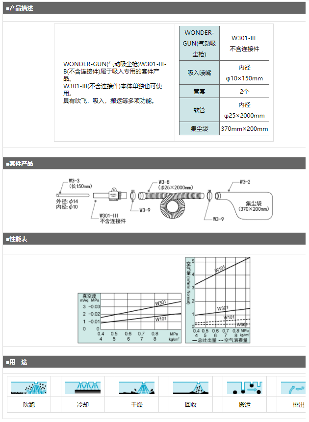 產品簡介: WONDER-GUN(氣動吸塵槍)W301-III-B(不含連接件)屬于吸入專用的套件產品。 W301-III(不含連接件)本體單獨也可使用。 具有吹飛,吸入,搬運等多項功能。