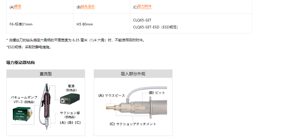負壓吸住螺絲,省去了撿螺絲的麻煩。也可吸附不銹鋼等有色金屬螺絲,高效作業(yè)。也可以去除螺絲擰緊過程中產(chǎn)生的灰塵。訂購時訂購吸力型時,請分別購買(A)和(B)。如果您想將您現(xiàn)有的螺絲刀改成吸氣式,請單獨購買(A) (B) (C)。A) 和 (B) 有多種尺寸可供選擇,具體取決于所使用的螺釘尺寸。