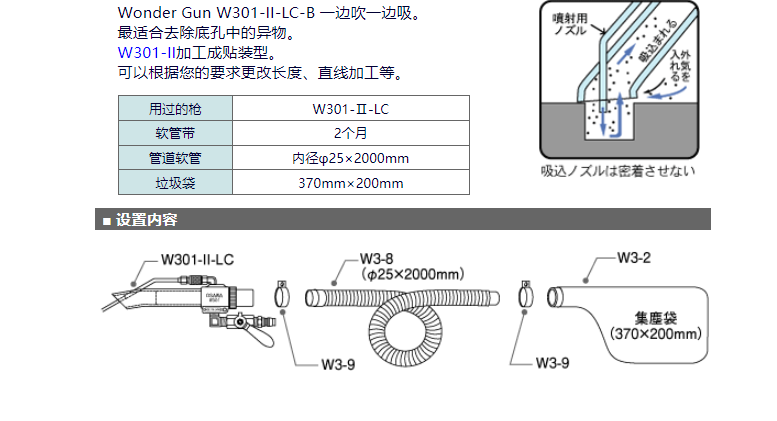 大澤W301-II-LC-B 一邊吹一邊吸。適合去除底孔中的異物。W301-II加工成貼裝型??梢愿鶕?jù)您的要求更改長度、直線加工等。我們有多種產(chǎn)品可以滿足您的需求,例如可以代替鑷子使用的超緊湊型鉛筆型,適合從細(xì)小區(qū)域收集灰塵,以及可以進(jìn)行全面噴砂的鼓風(fēng)型.