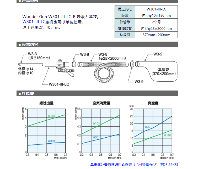 大澤吸塵槍 W301-III-LC-B 是吸力套裝。W301-III-LC主機也可以單獨使用。請用它來吹、吸、運。尤其是螺旋噴射式產品,有效利用壓縮空氣作為動力源,槍內完全呈圓柱形,無障礙物,完全不用擔心吸運過程中有物體堵塞內部。