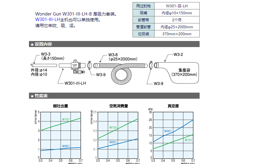 大澤 W301-III-LH-B 是吸力套裝。W301-III-LH主機也可以單獨使用。請用它來吹、吸、運。通過連接壓縮機的壓縮空氣,是一款無噪音的吸塵器,可吸水、吸油、小碎石、金屬屑等,吸力強勁。由于驅動源是壓縮機的壓縮空氣,因此可以連續(xù)運行。此外,所有型號都配備了兼作過濾器的消音器,因此使用時非常安靜。