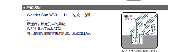 日本進(jìn)口W301-II-LH 一邊吹一邊吸適合去除底孔中的異物。W301-II加工成貼裝型。可以根據(jù)您的要求更改長度、直線加工等。