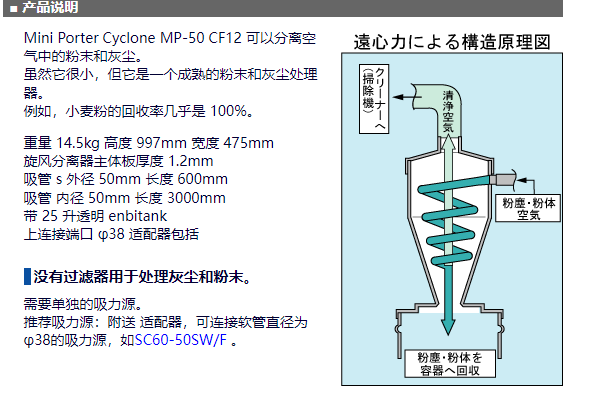 Mini Porter Cyclone MP-50 CF12 可以分離空氣中的粉末和灰塵。雖然它很小,但它是一個(gè)成熟的粉末和灰塵處理器。例如,小麥粉的回收率幾乎是 100%。重量 14.5kg 高度 997mm 寬度 475mm旋風(fēng)分離器主體板厚度 1.2mm吸管 s 外徑 50mm 長(zhǎng)度 600mm吸管 內(nèi)徑 50mm 長(zhǎng)度 3000mm帶 25 升透明 enbitank上連接端口 φ38 適配器包括
