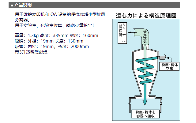 用于維護(hù)復(fù)印機(jī)和 OA 設(shè)備的便攜式超小型旋風(fēng)分離器。用于實(shí)驗(yàn)室、化驗(yàn)室收集、輸送少量粉塵!重量:1.3kg 高度:335mm 寬度:160mm吸嘴:外徑:19mm 長度:130mm吸管:內(nèi)徑:19mm,長度:2000mm帶3升透明恩必坦