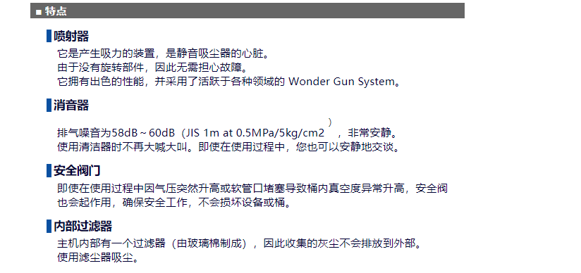 Silent Cleaner SC60-32SG 可以吸入壓縮空氣(compressor air)作為驅(qū)動源。強力收集水、油、污泥、谷物、小礫石、金屬碎片等傳統(tǒng)工業(yè)清潔劑無法充分收集的物質(zhì)。非常適合任何工作場所。2級結(jié)構(gòu)/多重過濾器!長時間連續(xù)使用OK!吸力強、降噪的吸塵器。重量:23kg 高度:1,011mm 寬度:550mm吸嘴:外徑:32mm 長度:700mm吸管:內(nèi)徑:32mm 長度:2000mm60 升帶腳輪的不銹鋼罐。也可提供標準型。