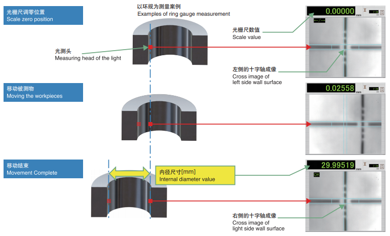 IDM是利用光測頭自動捕捉被測物壁面的測量點(diǎn),光測頭通過十字線測量軸進(jìn)行觀察和追蹤被測物。通過光柵尺追蹤, 得出被測物壁面的尺寸。