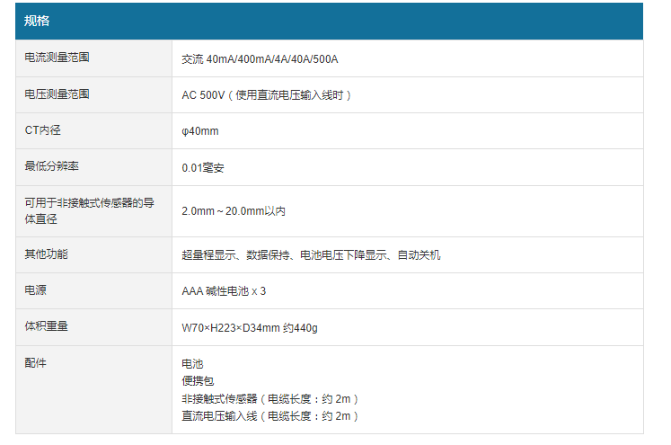 電壓測量范圍 AC 500V(使用直流電壓輸入線時)CT內(nèi)徑 φ40mm低分辨率 0.01毫安