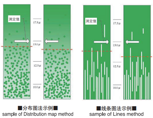 分布圖法測評(píng):將粒度計(jì)平放,從斜上方20~30°的位置 觀察。讀取顆粒開始密集部分的刻度。