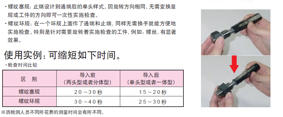 螺紋規(guī)-般設計為通端、止端分別在手柄的兩側,或者通端、止端各有一個手柄的單頭型。無論是規(guī)格,擰入通端后,從通端拔下來,然后變換手勢或者變換方向,再用止端檢查,都過于花費時間。檢查數(shù)量多、頻度高的時候,不僅花費時間,也會加重檢查人員的負擔。接檢查的話就無法得出正確的判定結果。
