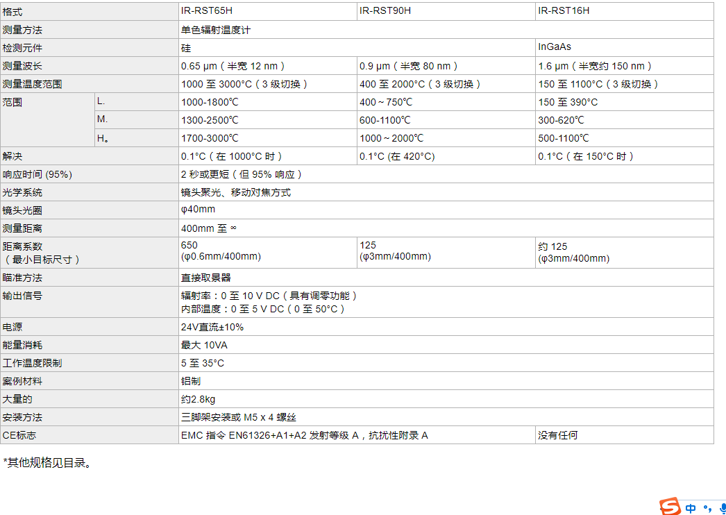 IR-RST 是一種單色輻射溫度計,用作使用比較黑體爐對輻射溫度計進(jìn)行比較校準(zhǔn)的標(biāo)準(zhǔn)。格式 IR-RST65H IR-RST90H IR-RST16H測量方法 單色輻射溫度計檢測元件 硅 InGaAs測量波長 0.65 μm(半寬 12 nm) 0.9 μm(半寬 80 nm) 1.6 μm(半寬約150 nm)測量溫度范圍 1000 至 3000°C(3 級切換) 400 至 2000°C(3 級切換) 150 至 1100°C(3 級切換)范圍 L. 1000-1800℃ 400~750℃ 150 至 390°CM. 1300-2500℃ 600-1100℃ 300-620℃