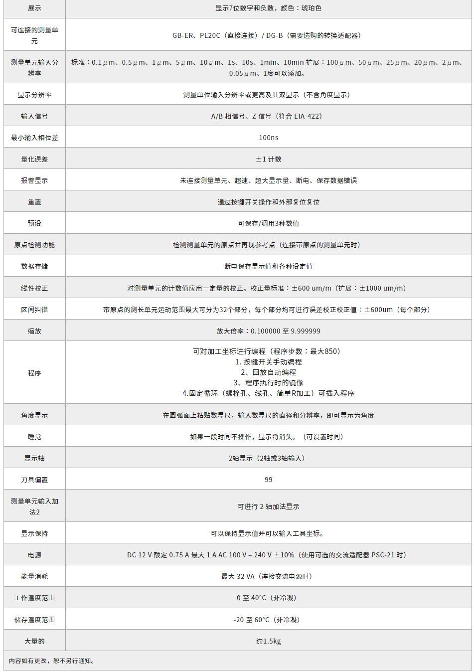 鎂鱗片配備車(chē)床功能小顯示量切換區(qū)間糾錯(cuò)數(shù)據(jù)存儲(chǔ)重置/預(yù)設(shè)測(cè)量單元原點(diǎn)檢測(cè)程序功能縮放車(chē)床規(guī)格(工具坐標(biāo)/加法功能)電源需要一個(gè)可選的交流適配器 (PSC21A)。配備車(chē)床功能小顯示量切換區(qū)間糾錯(cuò)數(shù)據(jù)存儲(chǔ)重置/預(yù)設(shè)測(cè)量單元原點(diǎn)檢測(cè)程序功能