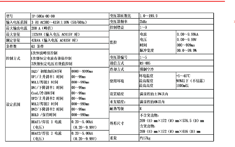 功率因數(shù)良好,供電情況穩(wěn)定焊接條件可以通過菜單選擇方法輕松設(shè)置具備5個保護功能無通電