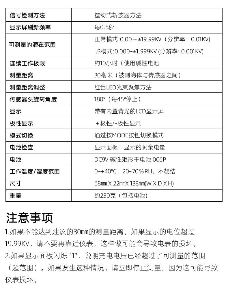 本款靜電場儀是一種帶有數(shù)字讀數(shù)的便攜式靜電場儀,用于測量帶電物體的電動勢。在測量波動的靜電時,可以暫時保持一個指示值,并在MAX模式下檢查電壓。特點可見的明亮LED窗口采用單按鈕控制,操作簡便●有兩種模式可供選擇:正常和操作模式傳感器頭損壞時會有錯誤指示有零點調整開關,可使電表恢復到零伏測量范圍為0-19.999KV可選擇電荷板來檢查電離器的離子平衡(P/N ODZ4-PLT)可選擇測量人體靜電的平板(P/N ODZ4-HPLT)標配180度旋轉傳感器頭,可以在各種角度進行測量傳感器頭和帶電物體之間的距離應該是1英寸遠