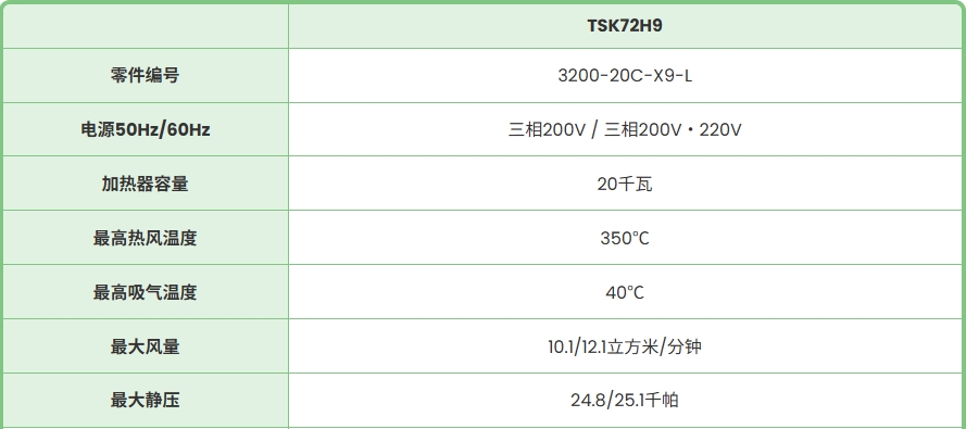 產(chǎn)品簡介: TSK72H9 零件編號 3200-20C-X9-L 電源50Hz/60Hz 三相200V / 三相200V?220V 加熱器容量 20千瓦 最高熱風溫度 350℃ 最高吸氣溫度 40℃ 最大風量 10.1/12.1立方米/分鐘 最大靜壓 24.8/25.1千帕