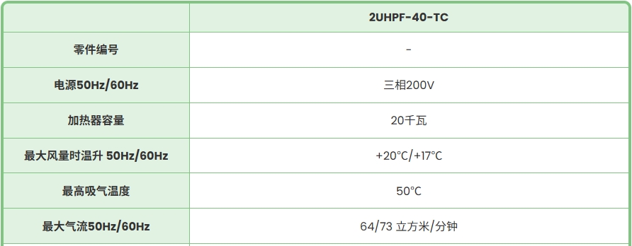 產(chǎn)品簡(jiǎn)介: 2UHPF-40-TC 電源50Hz/60Hz 三相200V 加熱器容量 20千瓦 最大風(fēng)量時(shí)溫升 50Hz/60Hz +20℃/+17℃ 最高吸氣溫度 50℃ 最大氣流50Hz/60Hz 64/73 立方米/分鐘