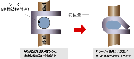 電極位移(熔深)預先通過焊接檢測器(帶位移監(jiān)測功能)設定。當位移量達到設定值時,輸出中斷信號并停止電流,從而實現以穩(wěn)定的位移量進行熔合。